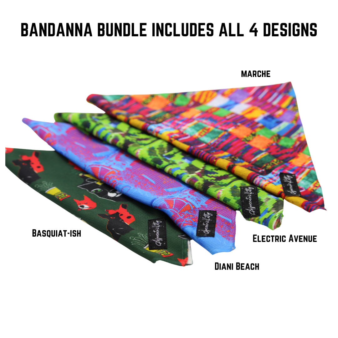 Let your furry friend strut their stuff in style with our Afrocentric Kitty Bandanna Bundle! This set of four bandannas showcases our bestselling designs: Marche, Electric Avenue, Diani Beach, and Basquiat-ish—each inspired by the rich vibrancy of Afrocentric art and culture.