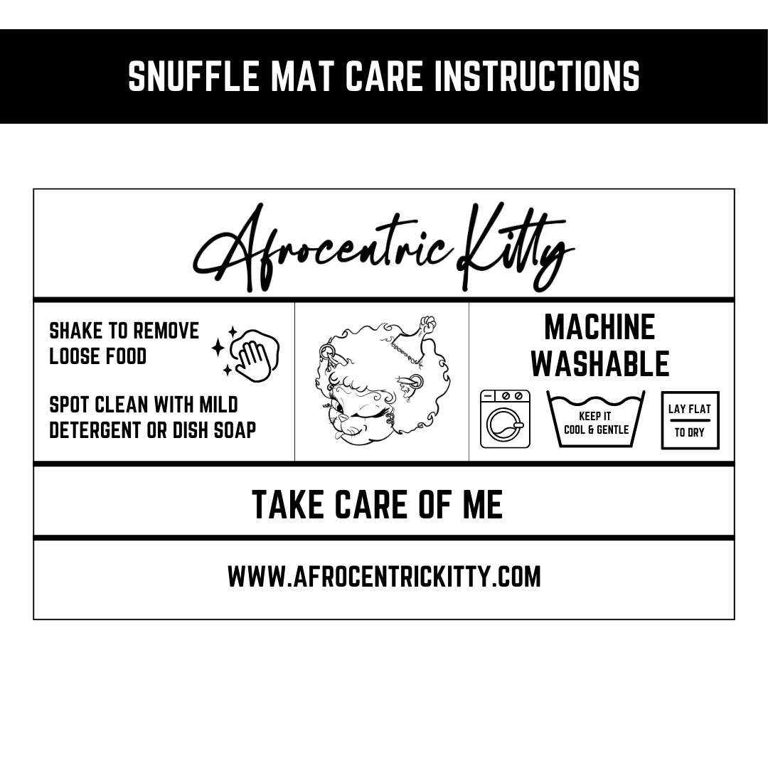 Snuffle care instructions: shake to remove loose food, spot clean with mild detergent or dish soap, wash cold, gentle cycle, lay flat to dry