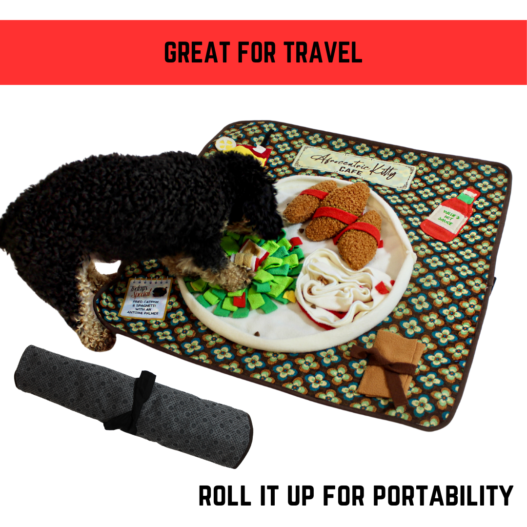 Sprinkle the mat with dry treats or dry pet food and let your pet dine at leisure!